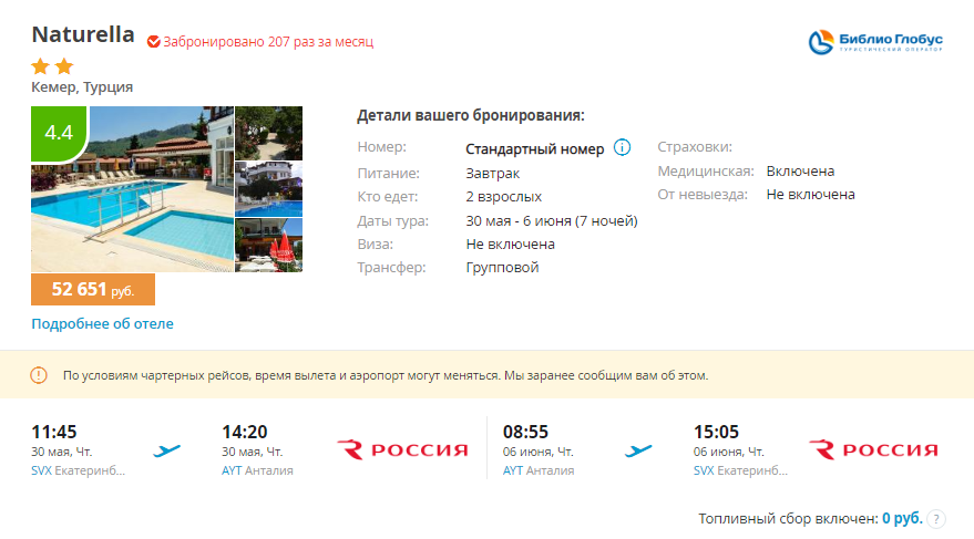 Горящий тур в Кемер, Турция из Екатеринбурга. В стоимость путевки, а это 26405 рублей за одного (52810 рублей за двоих) включен перелет, трансфер, проживание в отеле Naturella, медицинская страховка. Также в цене есть и завтраки, что очень немаловажно.